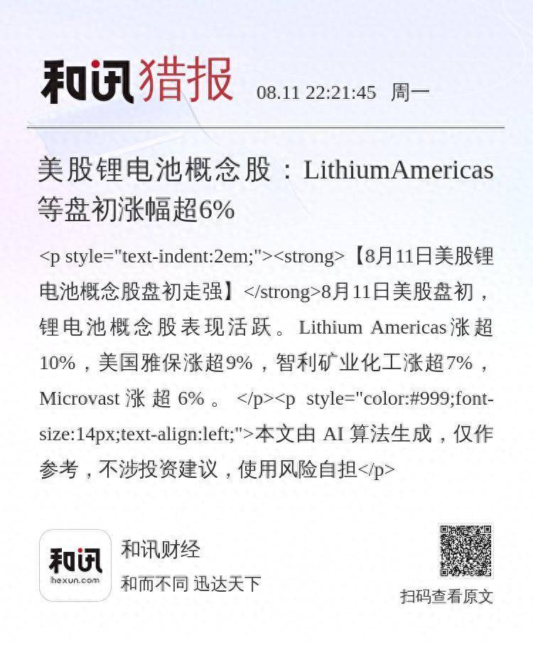 【8月11日美股锂电池概念股盘初走强】8月11日美股盘初,锂电池概念股表现活跃。Lithium Americas涨超10%,美国雅保涨超9%,智利矿业化工涨超7%,Microvast涨超6%。